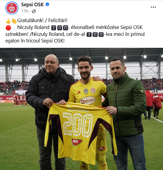 Niczuly Roland 2️⃣0️⃣0️⃣. élvonalbeli mérkőzése Sepsi OSK színekben! /Niczuly Roland, cel de-al 2️⃣0️⃣0️⃣-lea meci în primul eşalon în tricoul Sepsi OSK!”, a scris clubul din Sfântu Gheorghe pe propria pagină de Facebook.