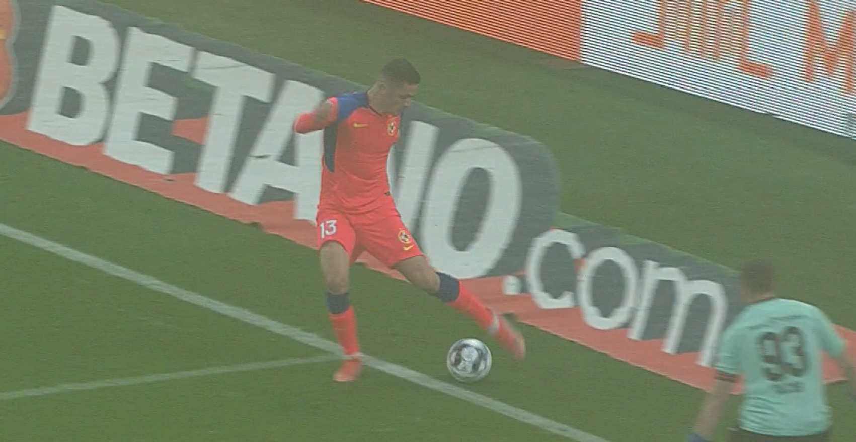 Andrei Dumiter centrează din afara terenului la faza care a dus la al doilea penalty acordat de arbitrul Marian Barbu