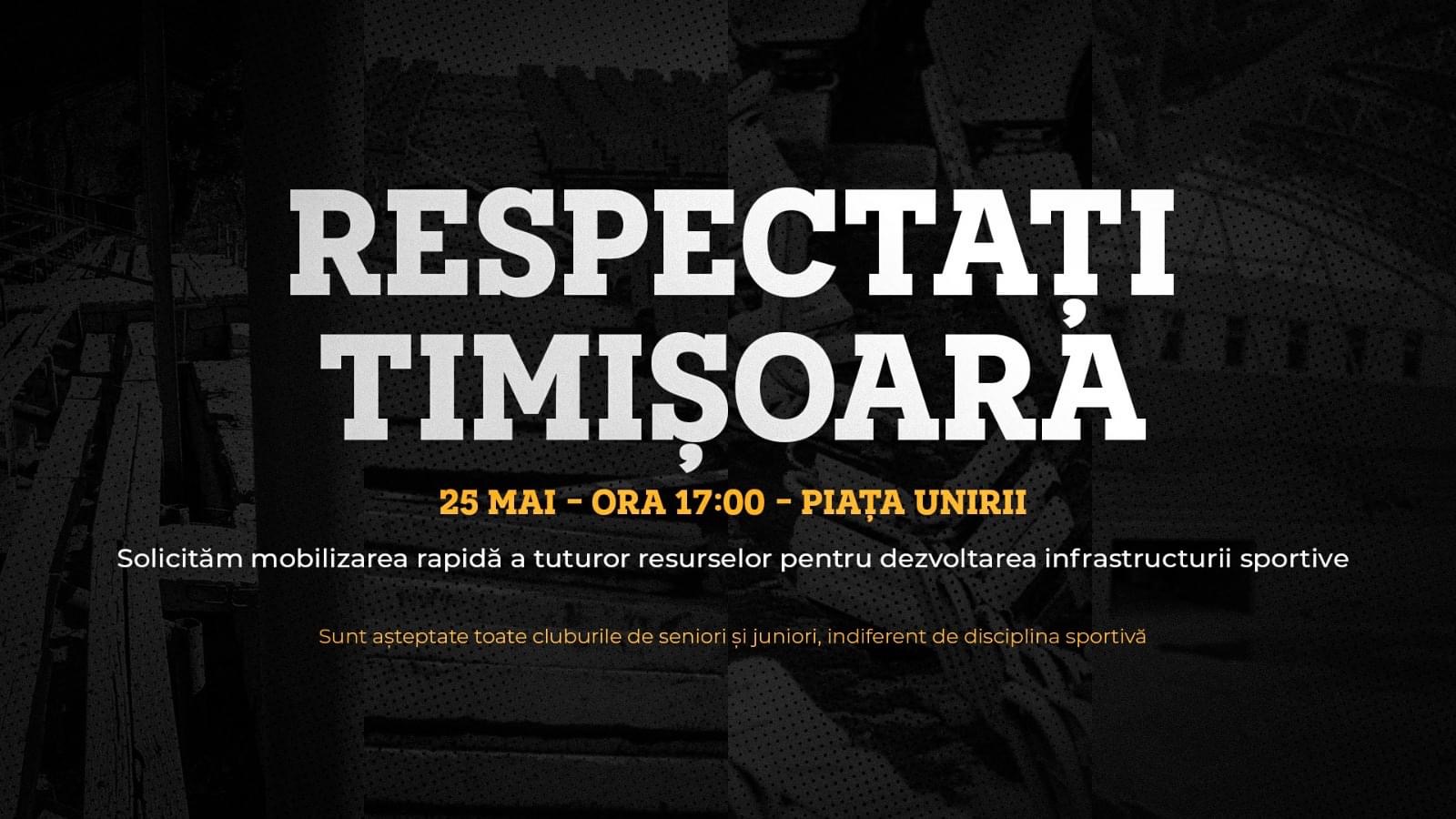 TIMIŞOARA VREA RESPECT! Îmbracă tricoul echipei la care activezi, al echipei preferate, vino oricum alături de coechipieri, colegi, prieteni, familie, JOI 25 MAI 2023, începând de la ORELE 17, în Piaţa Unirii să obligăm cumva autoritățile sa RESPECTE TIMIŞOARA ŞI TIMIȘORENII!”, se arată în comunicat.