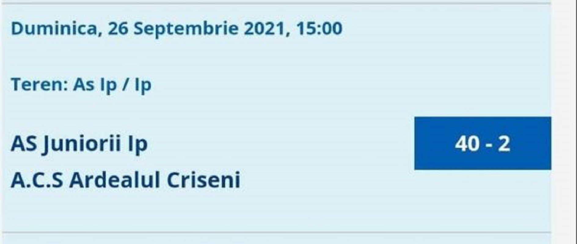 Concret, conform sursei citate, a fost modificat scorul meciului jucat de Juniorii Ip în etapa a treia, pe data de 26 septembrie 2021, contra celor de la Ardealul Crișeni. Pe teren, cei din Ip s-au impus cu scorul de 4-2. Iar acum, „din pix”, scorul a fost modificat în 40-2, pentru ca AS Juniorii Ip să treacă în clasament, și la golaveraj, peste cei de la Rapid Zimbor. Iar clasamentul de pe site să respecte realitatea stabilită la finalul sezonului. Astfel, echipa din Ip a terminat sezonul cu un golaveraj remarcabil, de 73-48.
