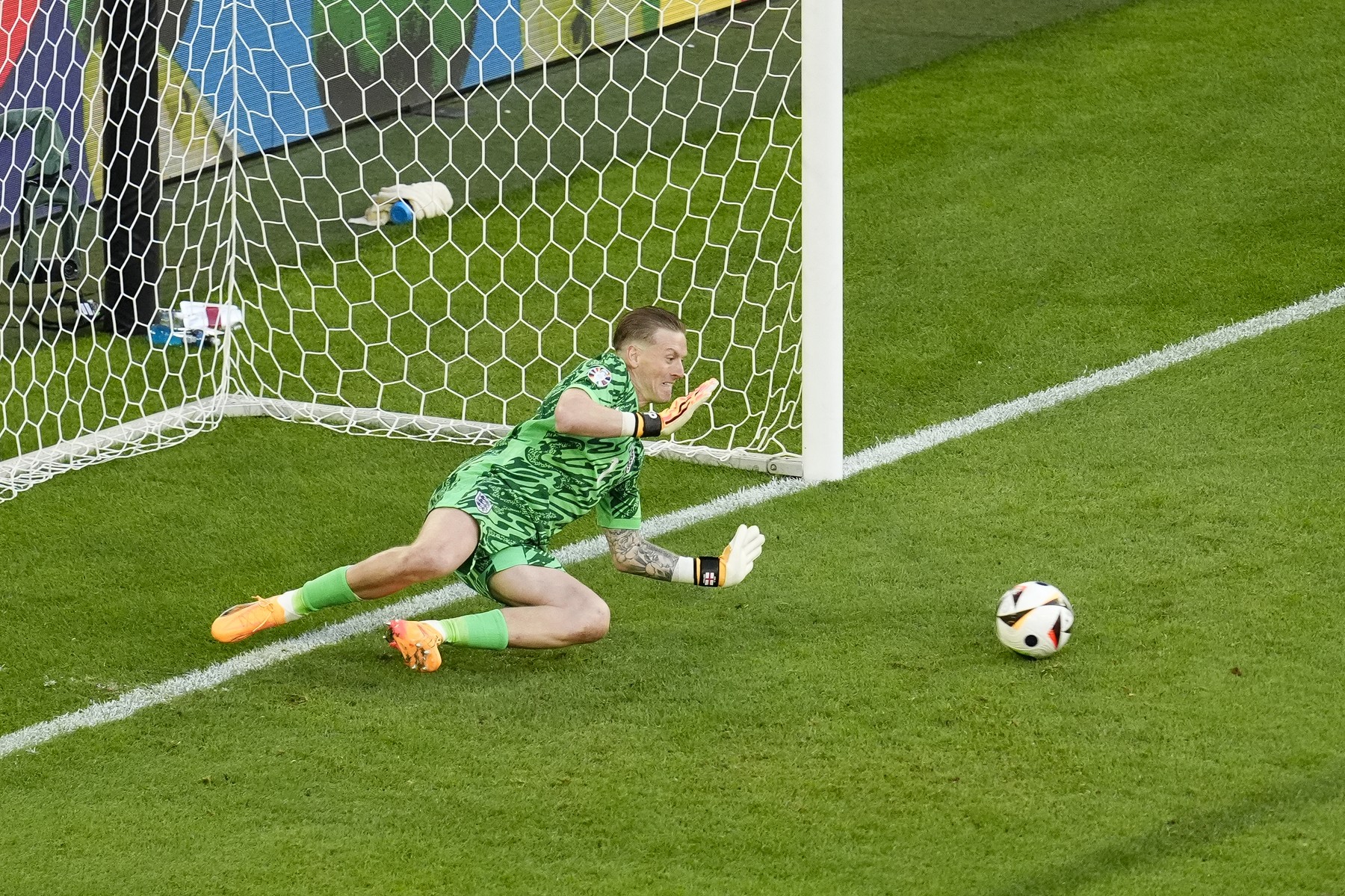Faza decisivă a meciului a fost atinsă la loviturile de departajare, unde Jordan Pickford a devenit eroul serii pentru Anglia. Portarul englez, cunoscut pentru meticulozitatea sa, și-a notat pe sticlă direcțiile preferate de executanți. Astfel, el a știut că Manuel Akanji, primul executant al Elveției, va șuta în stânga, reușind să apere lovitura.