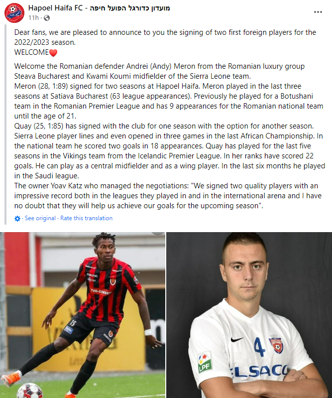 Hapoel Haifa a anunțat pe Facebook venirea lui Miron: