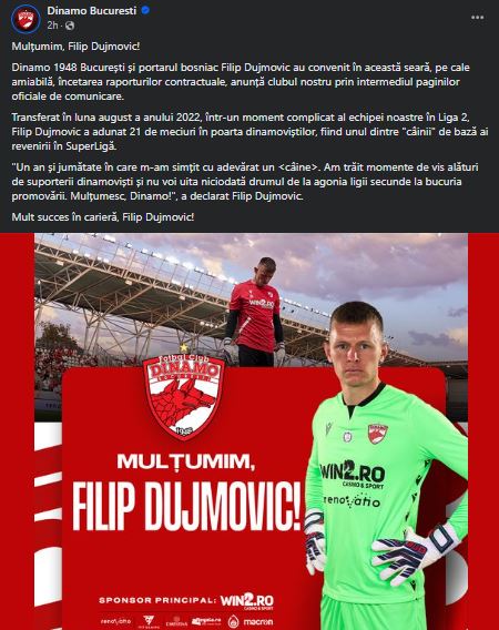 „Mulțumim, Filip Dujmovic! Dinamo 1948 București și portarul bosniac Filip Dujmovic au convenit în această seară, pe cale amiabilă, încetarea raporturilor contractuale, anunță clubul nostru prin intermediul paginilor oficiale de comunicare.