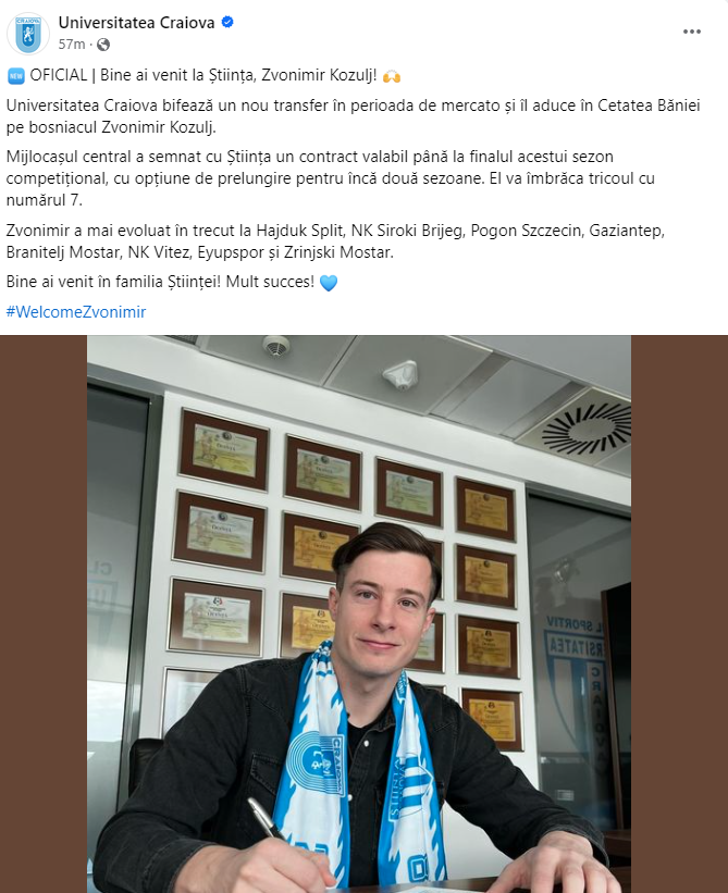 Universitatea Craiova a anunțat, printr-un comunicat oficial, transferul mijlocașului central Zvonimir Kozulj (30 de ani).