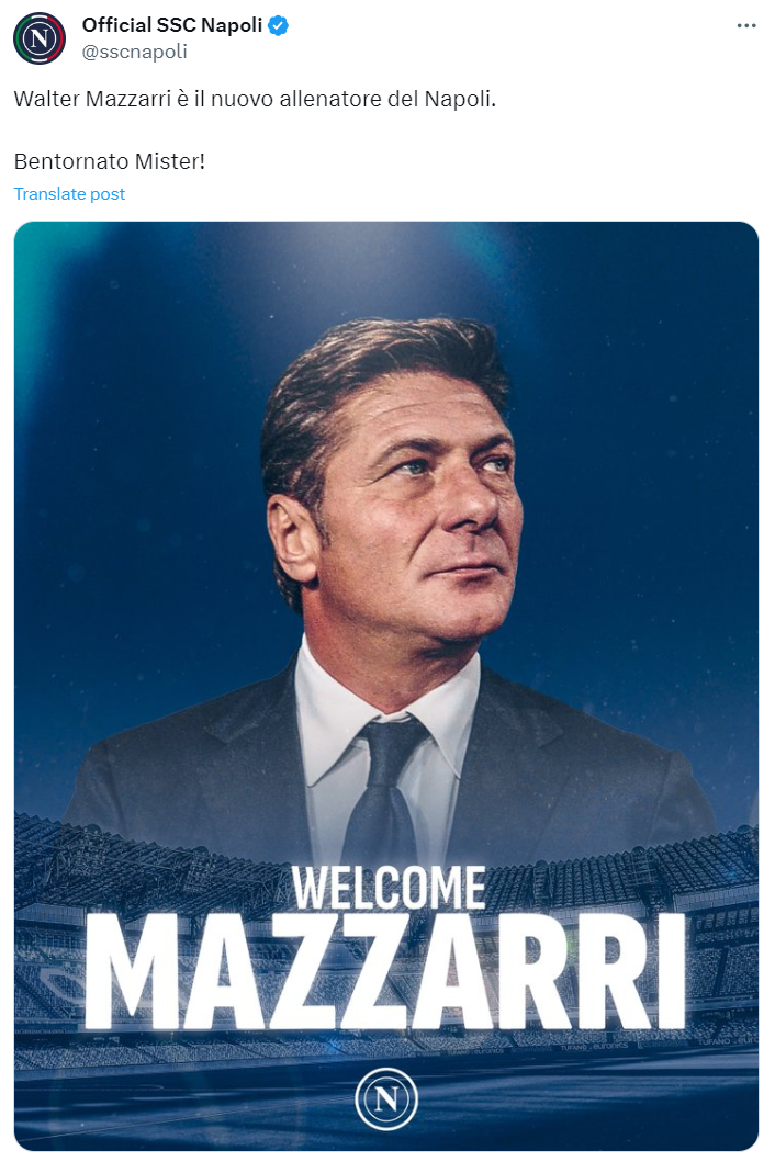Sătul de prestațiile oscilante ale napoletanilor sub comanda lui Rudi Garcia, președintele Aurelio De Laurentiis i-a găsit înlocuitor. Walter Mazzarri a semnat un contract valabil până la finalul stagiunii.