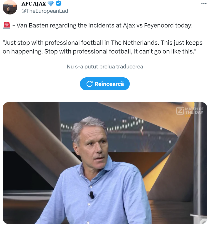 Marco Van Basten a oferit o reacție fără precedent după incidentele din super derby-ul Ajax – Feyenoord. Potrivit spuselor sale, Olanda ar trebui să pună capăt fotbalului profesionist.
