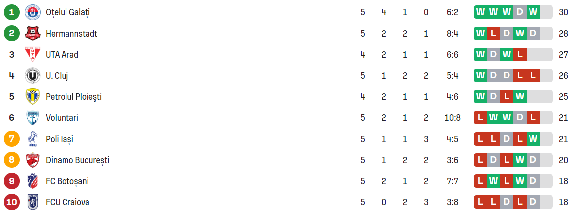 După patru etape disputate în playout, Oțelul Galați se află pe locul al doilea în clasament, cu un total de 27 de puncte. Echipa este la doar un punct distanță de liderul clasamentului, Hermannstadt, care a jucat însă un meci în plus.