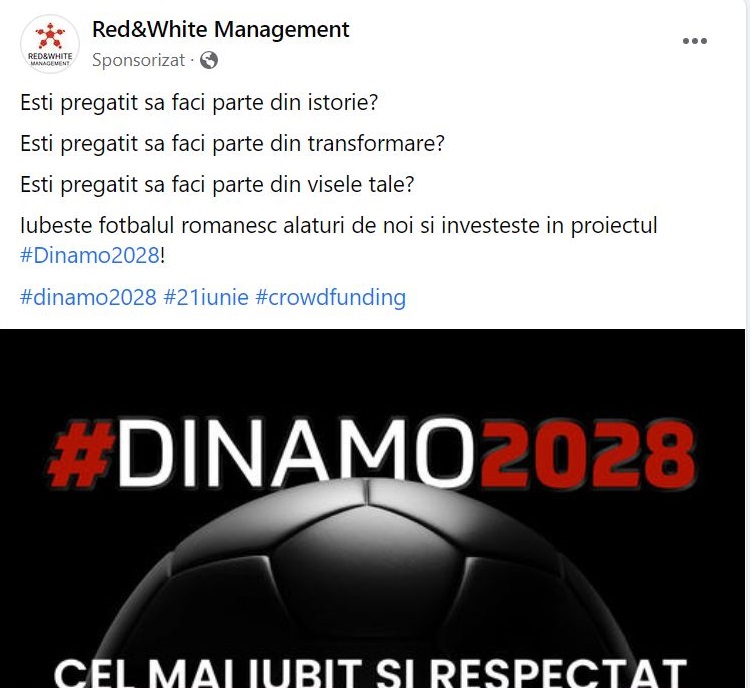 Până să vină bogații cu milioanele, Dinamo ia tot de la fanii de rând. Prin intermediul unei reclame postate pe facebook, suporterii „câinilor” sunt invitați de Red&White Management să investească în viitorul lui Dinamo. „Ești pregătit să faci parte din istorie? Ești pregătit să faci parte din transformare? Ești pregătit să faci parte din visele tale? Iubește fotbalul românesc alături de noi și investește în proiectul #Dinamo2028”, scrie în adul postat de pagina societății care controlează acum clubul.