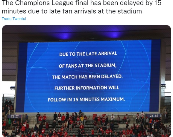 Cel mai așteptat eveniment din fotbalul european este pătat de evenimente incredibile. Ora de start a partidei a fost amânată cu 15 minute. UEFA a anunțat că măsura vine în întâmpinarea fanilor, care au întârziat pătrunderea în interiorul stadionului. Ulterior, forul european a revenit cu un nou anunț dezarmant pentru miile de spectatori și milioanele de spectatori care așteaptă evenimentul. Partida a fost amânată cu încă 15 minute.