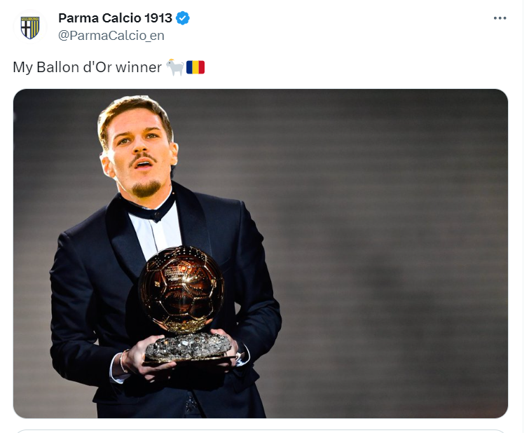 S-a terminat 4-2 pentru Parma, care a avansat în optimile de finală ale competiției. Este un rezultat mare pentru această formație, una care și-a arătat atașamentul față de Man cu o postare pe pagina de Twitter. Concret, aceștia au editat fața românului pe imaginea lui Karim Benzema de la gala în care a primit anul trecut Balonul de Aur. Totodată, aceștia au transmis că pentru ei Dennis Man este câștigătorul mult râvnitului trofeu.