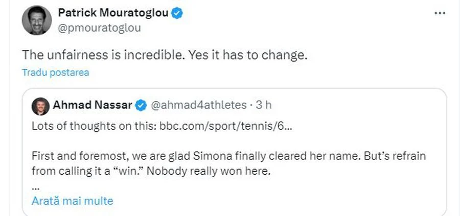 În urma deciziei recente a Tribunalului de Arbitraj Sportiv (TAS) privind cazul Simonei Halep, Patrick Mouratoglou, fostul ei antrenor, a luat cuvântul pe platforma X.