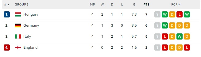 Lider este Ungaria, cu 7 puncte. Vecinii noștri au două victorii în Grupa 3. 1-0 cu Anglia și incredibilul 4-0 cu aceeași națională a Albionului.