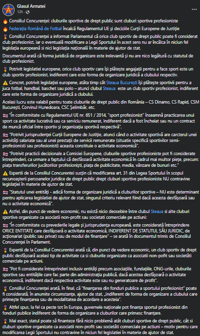 “Consiliul Concurenței a informat Parlamentul că orice club sportiv de drept public poate fi considerat club profesionist, iar o eventuală modificare a Legii Sportului în acest sens nu ar încălca în niciun fel legislația europeană și nici legislația națională în materie de ajutor de stat“, se menționează în postarea de pe Facebook.