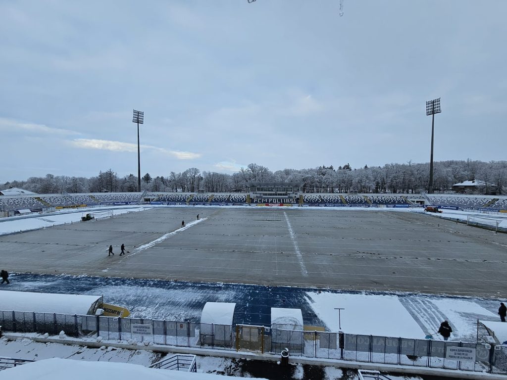 Muncitorii au început să îndepărteze zăpada de pe teren și din tribune încă de la ora 10:00. Gazdele meciului de astăzi au anunțat că dimineața pe teren era un strat de aproximativ 8 cm de zăpadă.