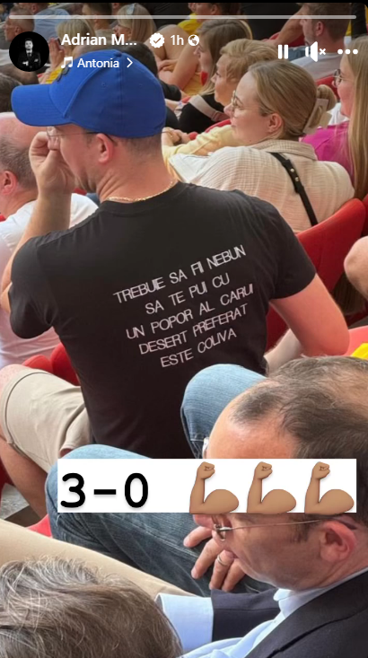Fostul internațional Adrian Mutu a captat atenția pe rețelele sociale printr-o postare în care apare un spectator purtând un tricou inscripționat cu mesajul: „Trebuie să fii nebun să te pui cu un popor al cărui desert preferat e coliva”.