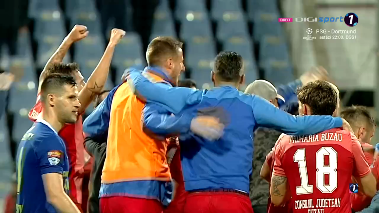 Buzăul e înapoi în Liga 1 după 15 ani! Artificii ca de Revelion sub ochii premierului Ciolacu. Cum au sărbătorit jucătorii și antrenorul Prepeliță