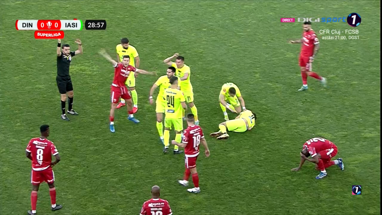 Atenție, imagini șocante la Dinamo – Poli Iași! Scos pe targă, cu mască de oxigen și guler cervical. Homawoo a luat doar galben după intrarea cuplită asupra lui Luca Mihai