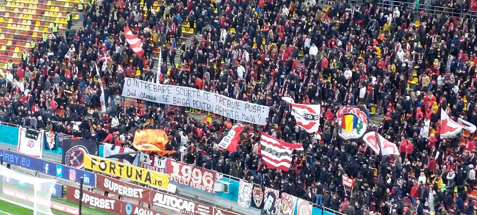 CRONICA ULTRAS. Peluza Nord Rapid vs Peluza Cătălin Hîldan. Rapidiștii s-au remarcat prin coregrafie și show-ul pirotehnic, dinamoviștii cu zecile de mesaje