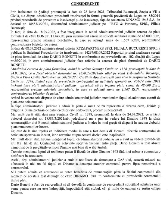 Asociația Peluza Cătălin Hîldan s-a adresat Tribunalului București printr-o contestație și solicită anularea admiterii cererii de plată pe care adminsitratorul judiciar – RTZ & Partners SPRL a acceptat-o în legătură cu creanța lui Dario Bonetti; […]