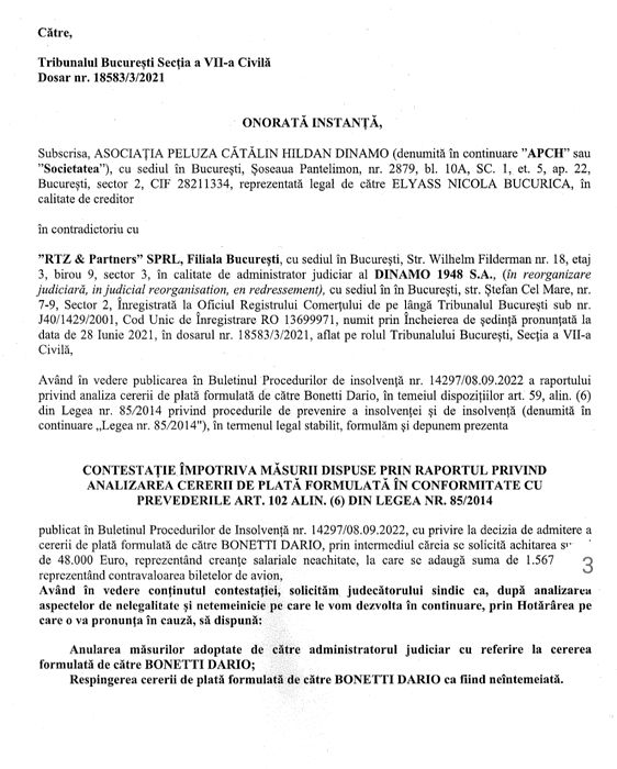 Asociația Peluza Cătălin Hîldan s-a adresat Tribunalului București printr-o contestație și solicită anularea admiterii cererii de plată pe care adminsitratorul judiciar – RTZ & Partners SPRL a acceptat-o în legătură cu creanța lui Dario Bonetti; […]