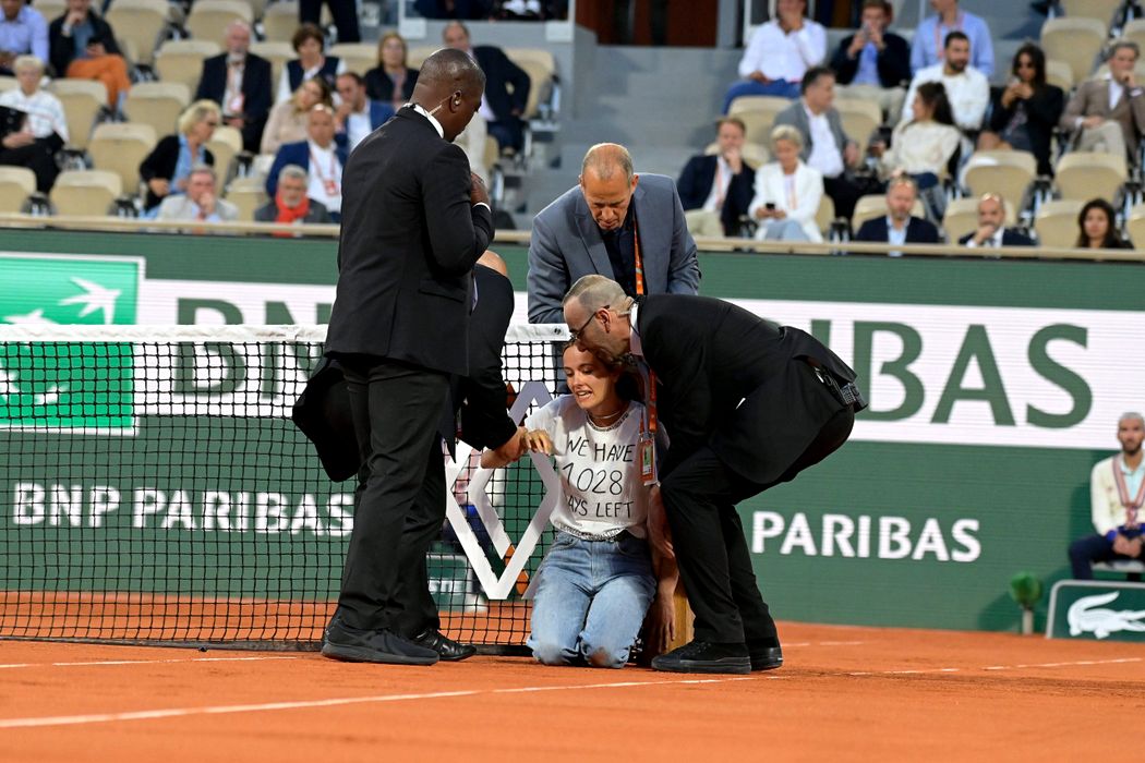 GALERIE FOTO Protest fără precedent la Roland Garros. O tânără s-a legat de fileu în timpul semifinalei Cilic – Ruud. Care a fost motivul revoltei