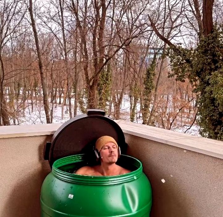 Imaginea zilei. Un fost campion cu FCSB și-a făcut „sală de recuperare” într-un butoi, în balconul apartamentului. Foto