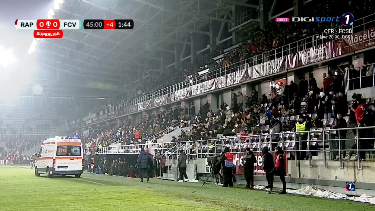 În finalul reprizei, unul dintre echipajele de pe ambulanță a fost solicitat în peluza Rapidului. După câteva momente de confuzie, doi membri ai staff-ului medical de la Rapid au alergat în Peluza Nord pentru a-i […]