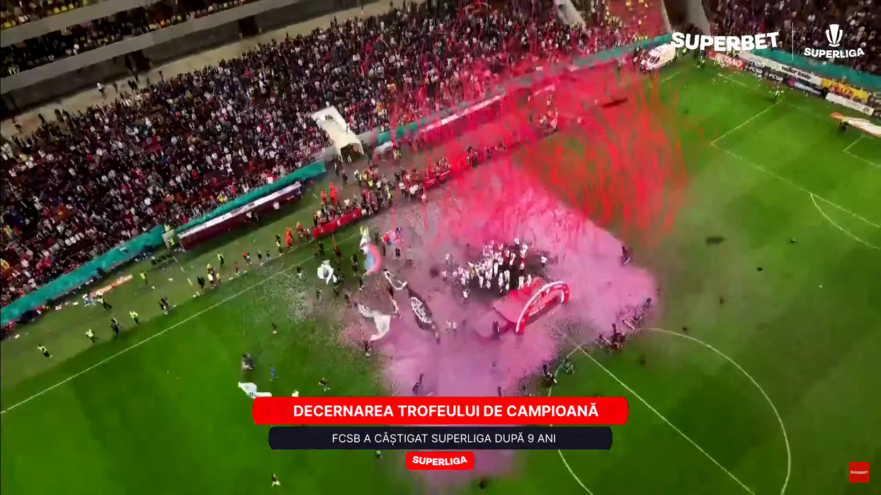 Scene FABULOASE pe Arena Națională! 50 000 de oameni au sărbătorit alături de Coman, Olaru şi de restul campionilor primul titlu după 9 ani. Stoica i-a prezentat pe jucători, într-o mare explozie de roşu şi albastru. Video integral