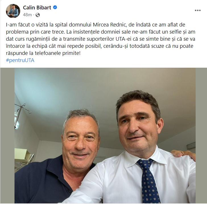 La insistențele domniei sale ne-am făcut un selfie și am dat curs rugăminții de a transmite suporterilor UTA-ei că se simte bine și că se va întoarce la echipă cât mai repede posibil, cerându-și totodată scuze că nu poate răspunde la telefoanele primite!”, este mesajul postat de Bibart, pe Facebook.