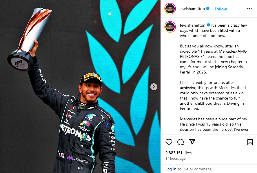 Lewis Hamilton a dat prima declarație publică în contul său de Instagram în care spune că, după ce a realizat cu Mercedes lucruri la care ar fi putut visa doar în copilărie, acum are șansa să-și împlinesc un alt vis din copilărie, „Driving in Ferrari red” („Să conduc în roșu Ferrari”).