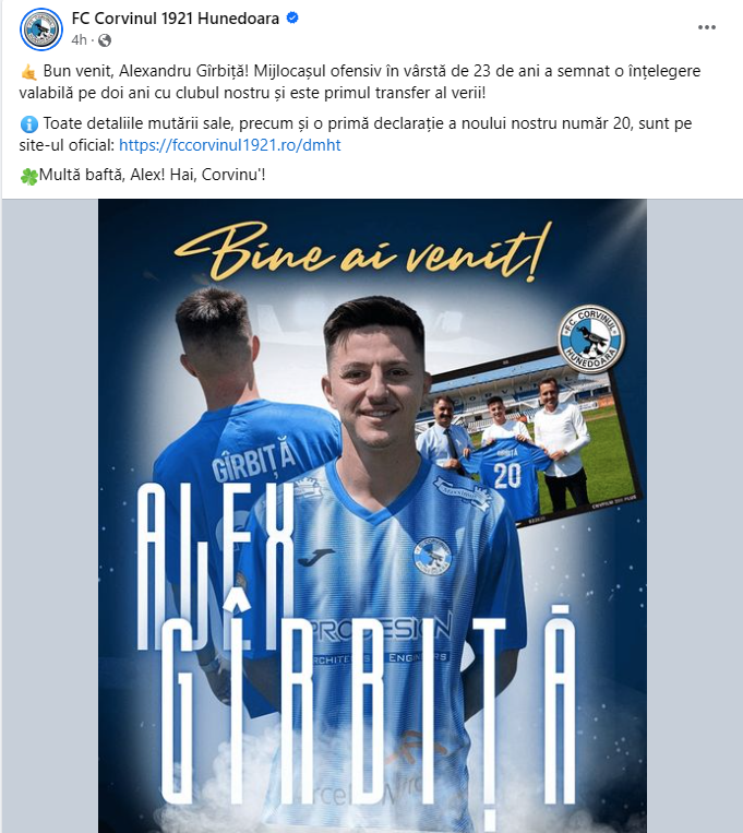 „Bun venit, Alexandru Gîrbiță! Mijlocașul ofensiv în vârstă de 23 de ani a semnat o înțelegere valabilă pe doi ani cu clubul nostru și este primul transfer al verii!”, au postat cei de la Corvinul pe pagina oficială de Facebook.