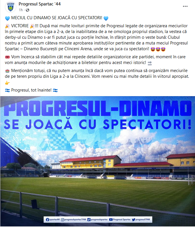 VICTORIE! După mai multe lovituri primite de Progresul legate de organizarea meciurilor în primele etape din Liga a 2-a, de la inabilitatea de a ne omologa propriul stadion, la vestea că derby-ul cu Dinamo s-ar fi putut juca cu porțile închise, în sfârșit primim o veste bună: clubul nostru a primit, acum câteva minute, aprobarea instituțiilor pertinente de a muta meciul Progresul Spartac – Dinamo București pe Clinceni Arena, unde se va juca cu spectatori!”