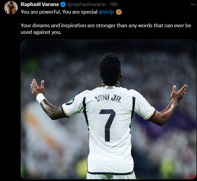 Fostul său coleg de la Real Madrid, Raphael Varane, a ținut să transmită un mesaj pe social media în care își arată sprijinul față de tânărul fotbalist. Acesta a scris: „Ești puternic. Ești special. Visele tale și inspirația ta sunt mai puternice decât orice cuvinte care pot fi folosite vreodată împotriva ta”.