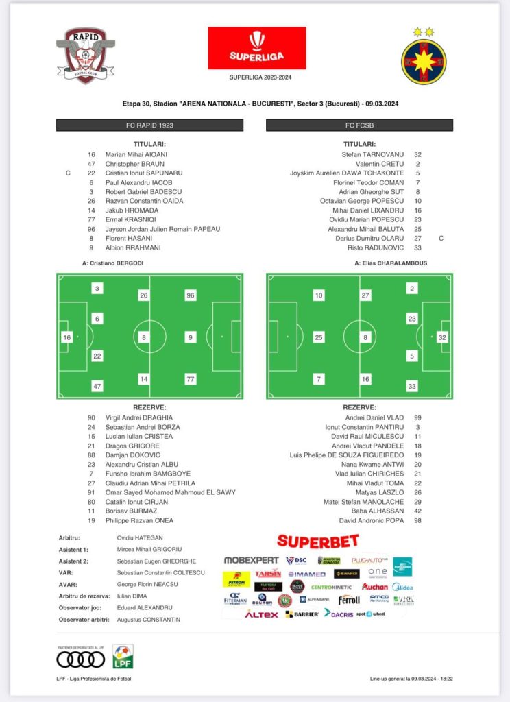 Rapid: Aioani – Braun, Săpunaru, Iacob, Bădescu – Hromada, Hasani, Oaidă – Krasniqi, Rrahmani, Papeau