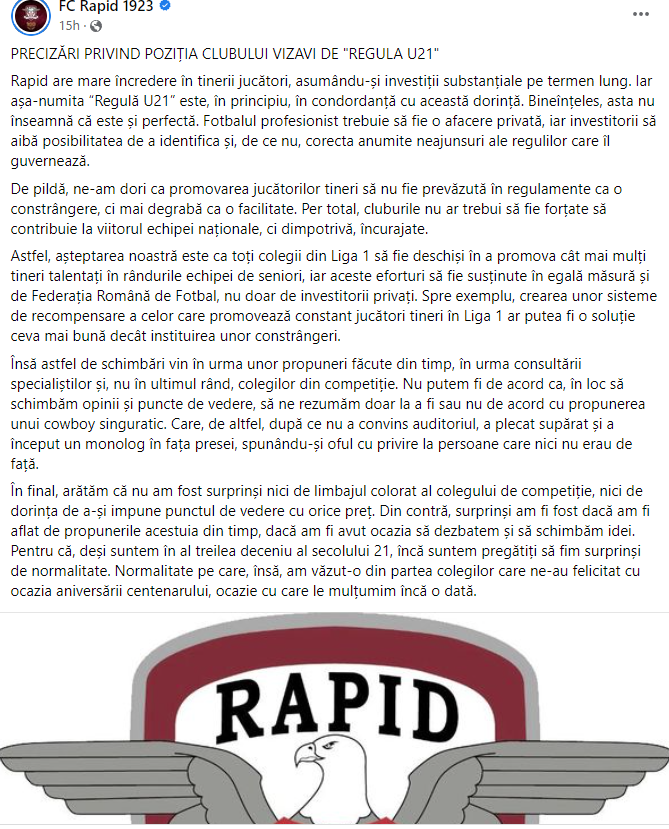 Rapid are mare încredere în tinerii jucători, asumându-și investiții substanțiale pe termen lung. Iar așa-numita «Regulă U21» este, în principiu, în concordanță cu această dorință. Bineînțeles, asta nu înseamnă că este și perfectă. Fotbalul profesionist trebuie să fie o afacere privată, iar investitorii să aibă posibilitatea de a identifica și, de ce nu, corecta anumite neajunsuri ale regulilor care îl guvernează.