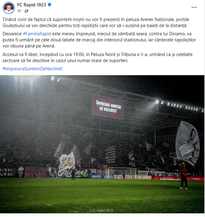 „Ținând cont de faptul că suporterii noștri nu vor fi prezenți în peluza Arenei Naționale, porțile Giuleștiului se vor deschide pentru toți rapidiștii care vor să-i susțină pe baieți de la distanță.