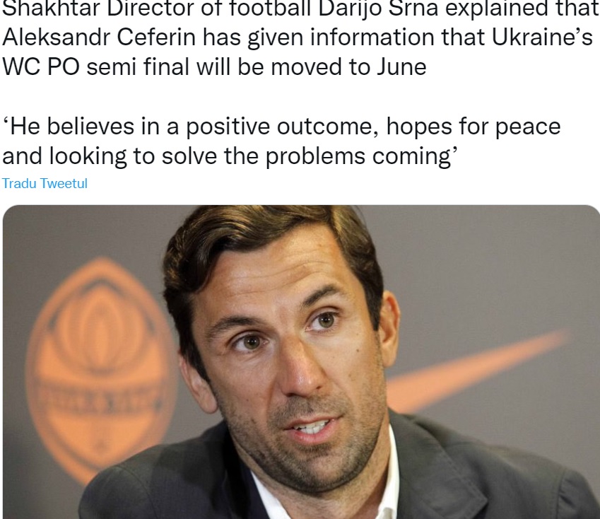 Înțeleg că nimănui nu-i pasă de fotbal în acest moment, dar șeful UEFA a precizat că jocul în cauză va fi amânat pentru 24 iunie”, a dezvăluit Dario Srna, directorul sportiv al lui Șahtior.
