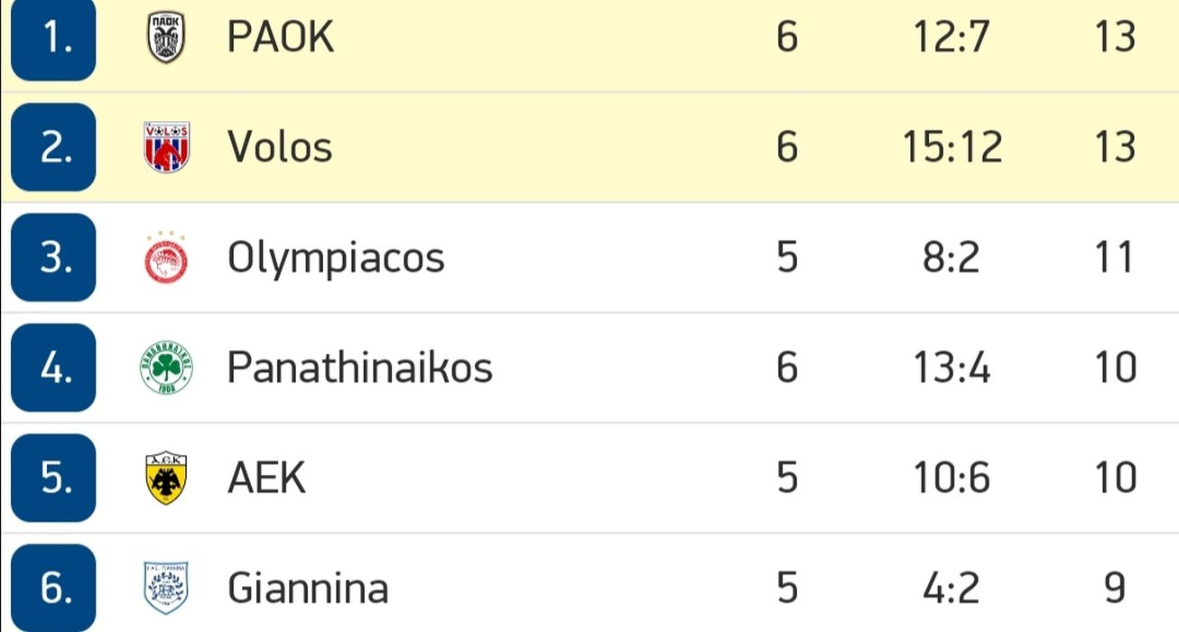 În urma rezultatulul din etapa a 6-a, PAOK rămâne lider, la egalitate cu Volos, 13 puncte, dar poate fi depășită de marea rivală Olympiakos. Atenienii au 11 puncte și un meci mai puțin jucat.