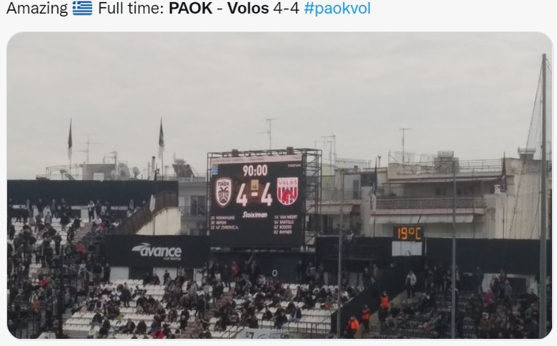Ziua s-a transformat într-o dramă pentru gazde, care s-au văzut egalate în minutul 80. Jean-Pierre Rhyner a marcat primul său gol pentru Volos și a dus scorul la 4-4.