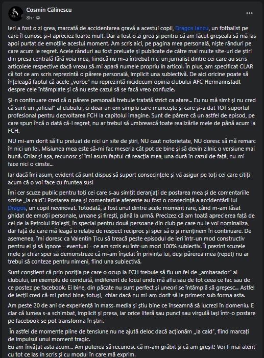 „Ieri a fost o zi grea, marcată de accidentarea gravă a acestui copil, Dragoș Iancu, un fotbalist pe care îl cunosc și-l apreciez foarte mult. Dar a fost o zi grea și pentru că am făcut greșeala să mă las apoi purtat de emoțiile acestui moment. Am scris aici, pe pagina mea personală, niște rânduri pe care acum le regret. Acele rânduri au fost preluate și publicate de către mai multe site-uri de știri din presa centrală fără voia mea, fiindcă nu m-a întrebat nici un jurnalist dintre cei care au scris articolele respective dacă vreau să-mi apară numele propriu în articol. În plus, am specificat CLAR că tot ce am scris reprezintă o părere personală, implicit una subiectivă.