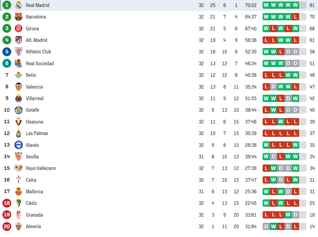 Dacă Real Madrid va reuși să câștige acest meci, distanța dintre cele două echipe s-ar mări la 11 puncte, lăsând Barcelona cu doar șanse matematice de a mai putea încheia pe primul loc.
