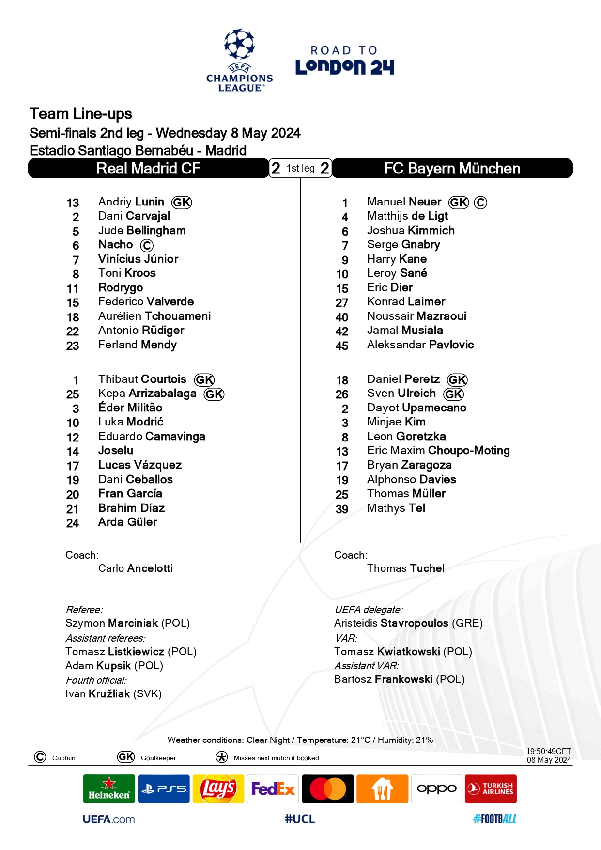 Real Madrid: Lunin – Carvajal, Rudiger, Nacho, Mendy – Valverde, Tchouameni, Kroos – Bellingham – Rodrygo, Vinicius Junior