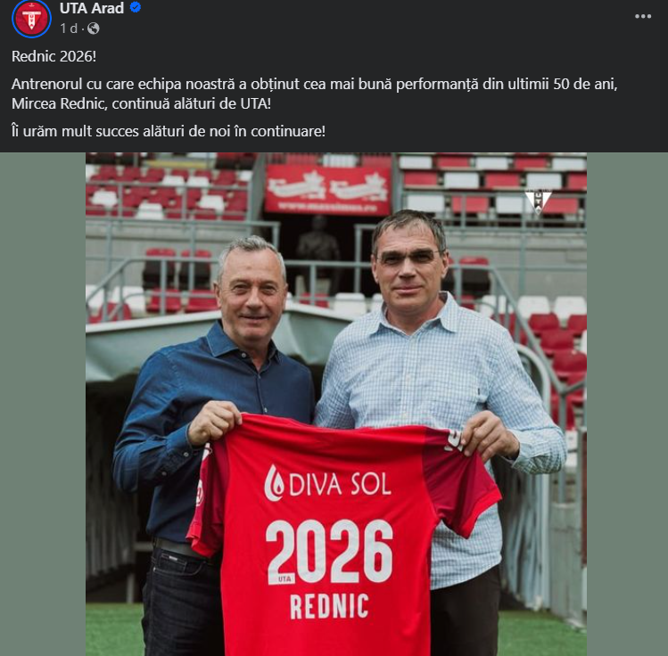 „Vești bune: Mircea Rednic rămâne antrenorul echipei UTA! Vreau să îmi exprim satisfacția pentru faptul că antrenorul Mircea Rednic va continua să antreneze UTA și în sezonul următor. În ciuda a ceea ce s-a vehiculat la nivel local, Rednic rămâne la noi, cel puțin un an. Subliniez faptul că Primăria Arad rămâne partener al clubului, inclusiv din punct de vedere financiar”, a declarat primarul Călin Bibarț pe rețelele sociale.