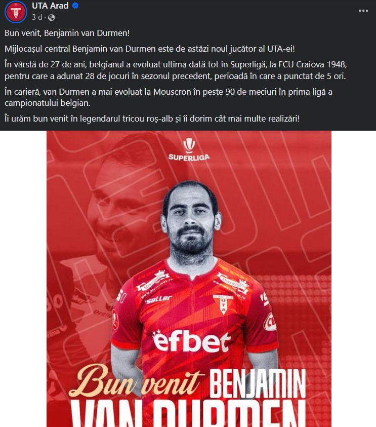 „Bun venit, Benjamin van Durmen! Mijlocașul central Benjamin van Durmen este de astăzi noul jucător al UTA-ei! Îi urăm bun venit în legendarul tricou roș-alb și îi dorim cât mai multe realizări!”, a transmis clubul pe Facebook.