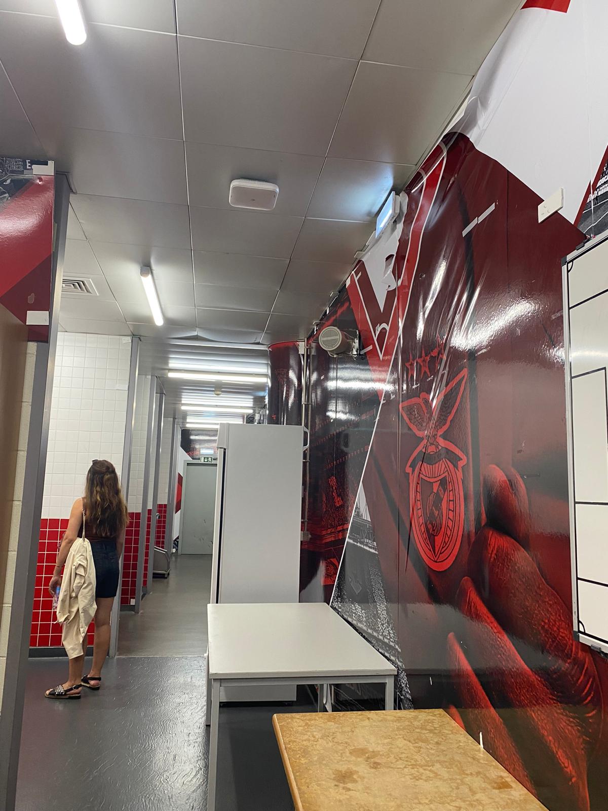 Vestiarul dedicat echipei vizitatoare arată destul de sărăcăcios. Tricourile gazdelor sunt acum agățate peste tot dar dispar cu câteva ore înaintea meciurilor. Angajații stadionului ne explică râzând că totul are un rost iar vestiarul Benficăi e cu totul altceva, din toate punctele de vedere, la nivel de condiții, însă nu poate fi descoperit publicului (FOTO 6).