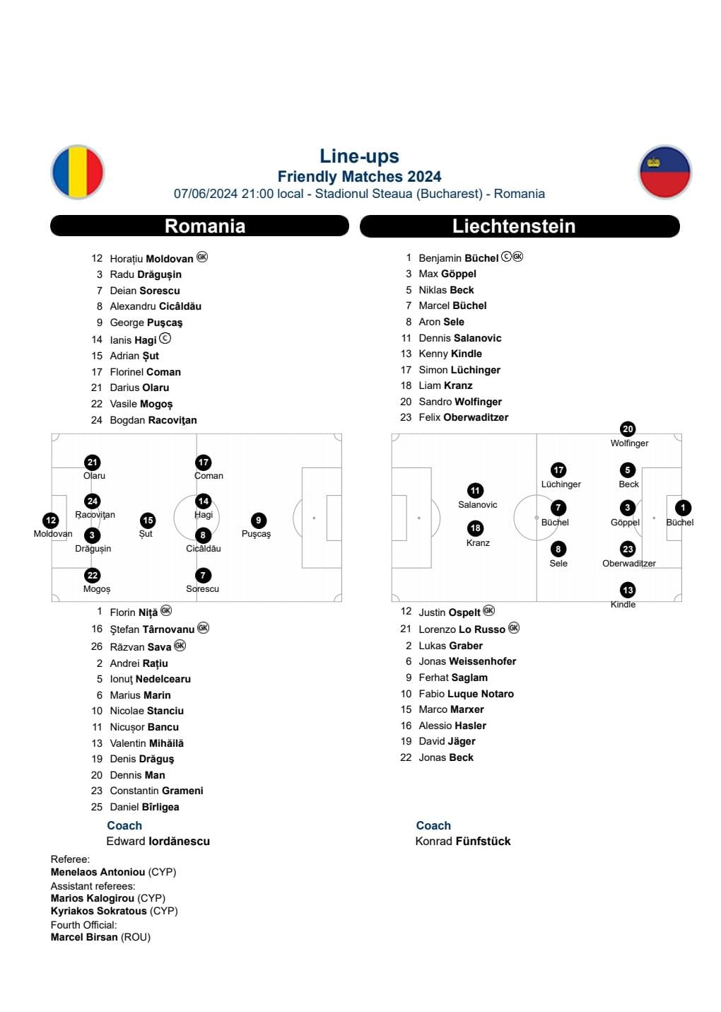 ROMÂNIA: 12. Moldovan – 7. Sorescu, 3. Drăgușin, 24. Racovițan, 22. Mogoș – 8. Cicâldău, 15. Șut, 21. Olaru – 14. Hagi-cpt., 9. Pușcaș, 17. F. Coman,.