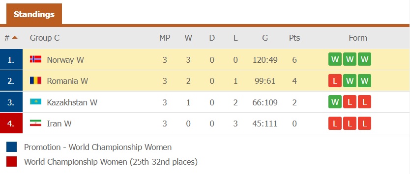 În urma rezultatului din meciul 3 din faza grupelor, Norvegia încheie lider, cu 6 puncte, urmată în clasament de România 4, Kazakhstan 2, şi Iran, niciun punct.