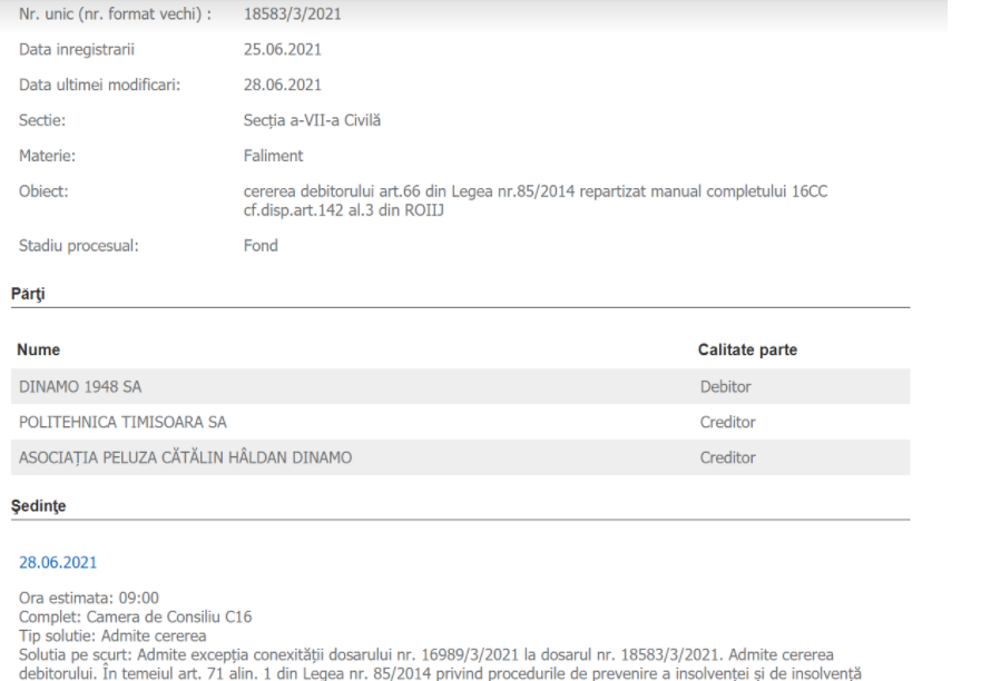 Societatea care administrează clubul de fotbal Dinamo a solicitat, vineri, la Tribunalul Bucureşti deschiderea procedurii de insolvenţă. Cel puțin așa arată portalul instanţelor de judecată. Ei bine, la nici trei zile, jucătorii roș-albi au primit răspuns favorabil. S-a admis cererea de intrare în insolvență. Decizia aparține Tribunalului București, care a a anunțat, în urmă cu puțin timp, admiterea cererii de intrare în insolvență a societății Dinamo 1948 SA.