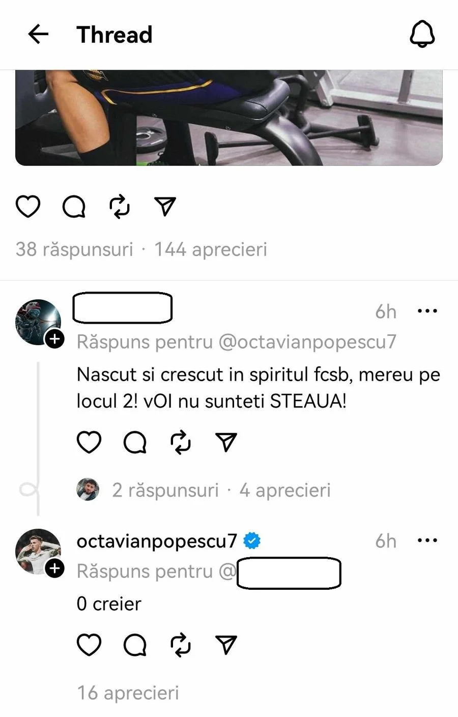 „Născut și crescut în spiritul FCSB, mereu pe locul 2! Voi nu sunteți Steaua”, a scris acesta. Răspunsul lui Octavian Popescu nu s-a lăsat prea mult așteptat: „Zero creier”.