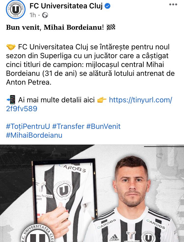 „FC Universitatea Cluj se întărește pentru noul sezon din Superliga cu un jucător care a câștigat cinci titluri de campion: mijlocașul central Mihai Bordeianu (31 de ani) se alătură lotului antrenat de Anton Petrea”, se arată în comunicatul postat de Universitatea Cluj, pe Facebook.